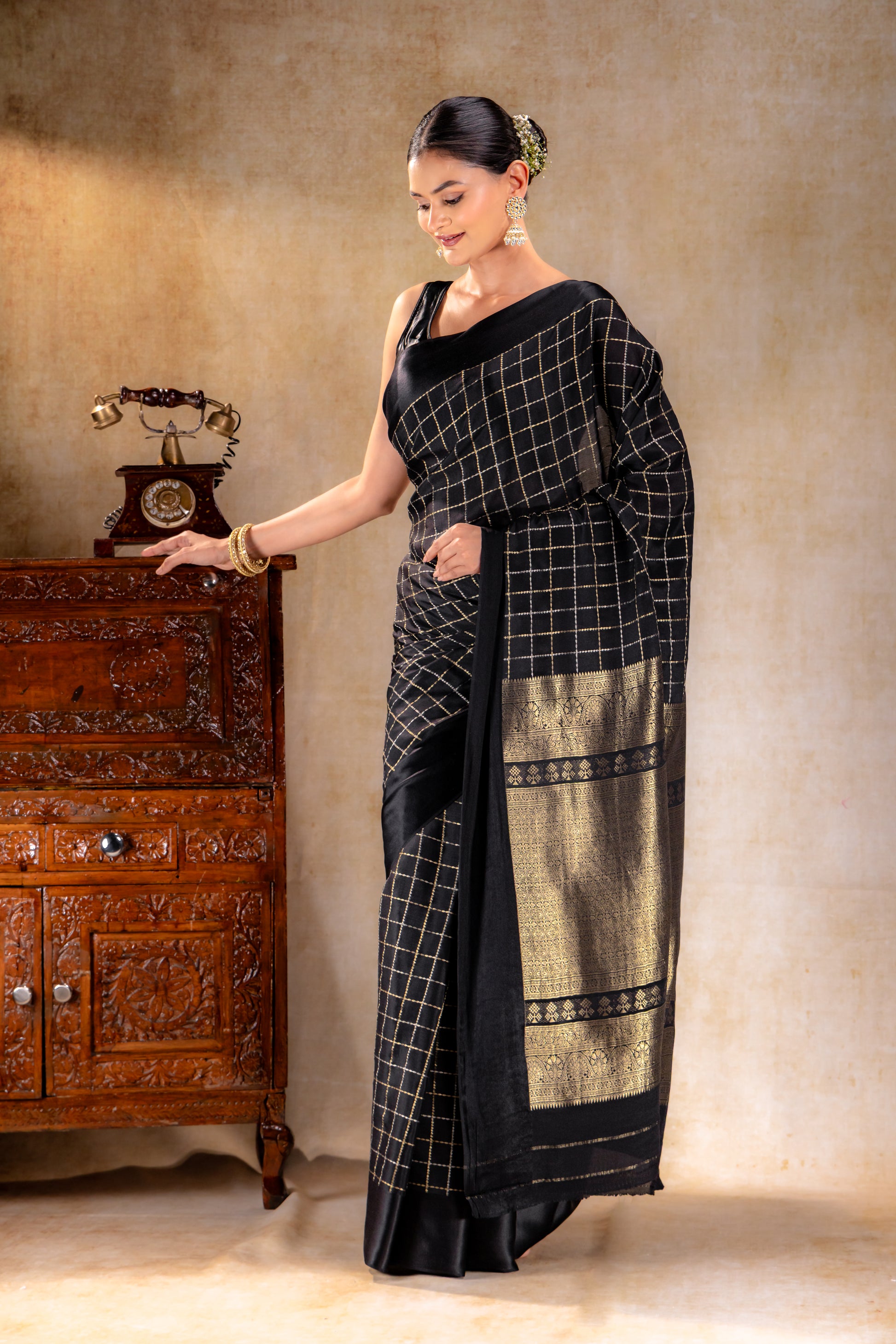 Charcoal Black Crepe Saree with Gold-Silver Check Lines with Satin Border