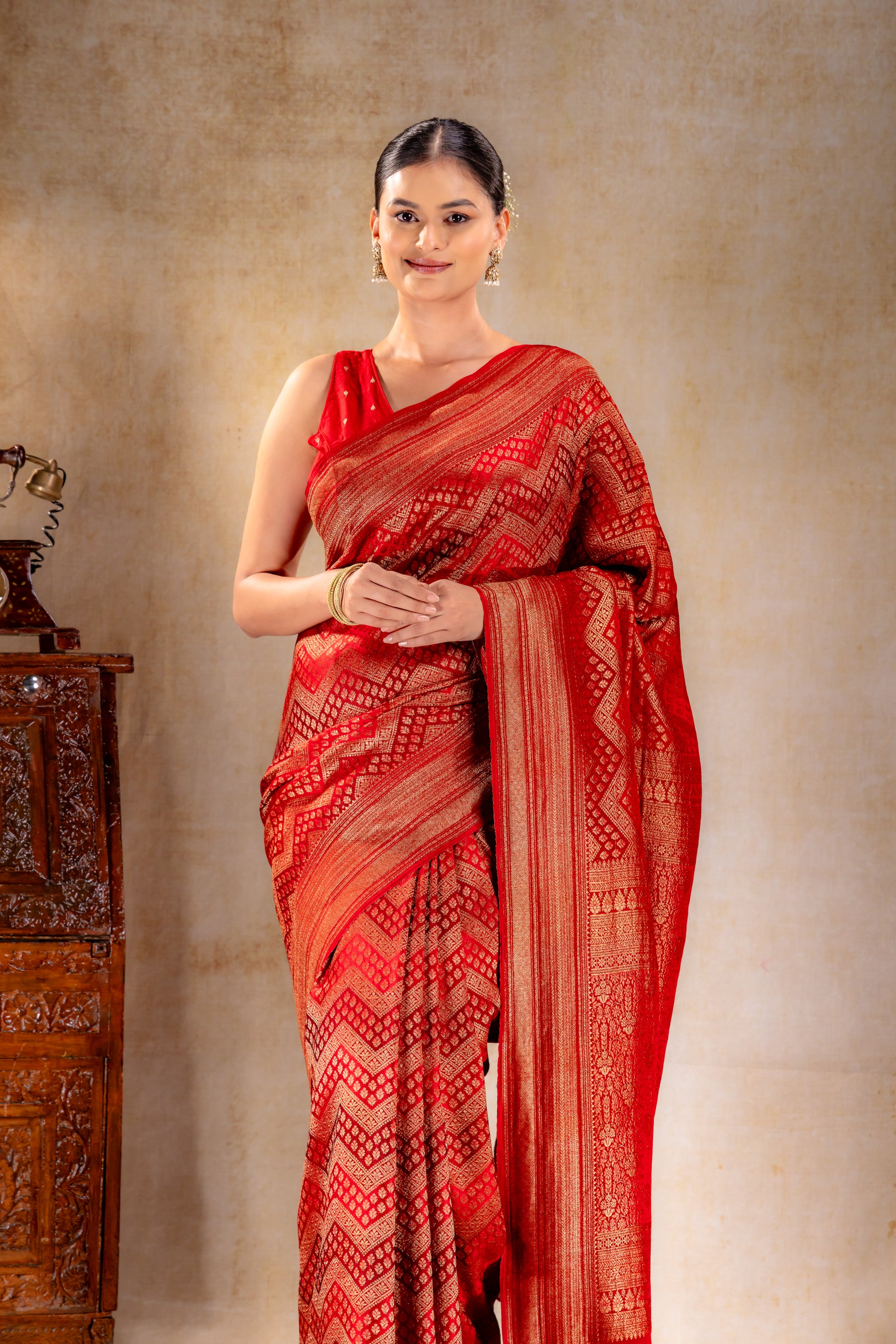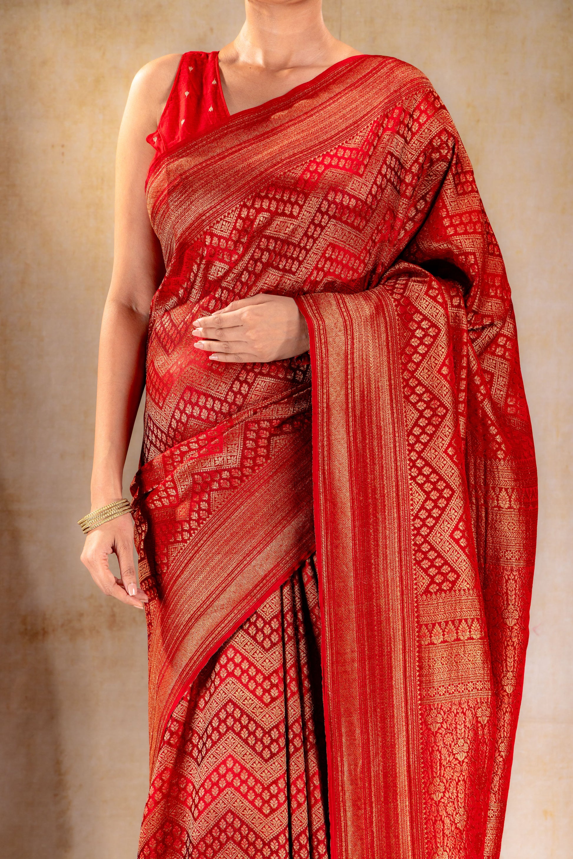 A regal deep red Banarasi silk saree, vat dyed to perfection and adorned with antique gold zari. A timeless pick for weddings, festive wear, and traditional ceremonies.