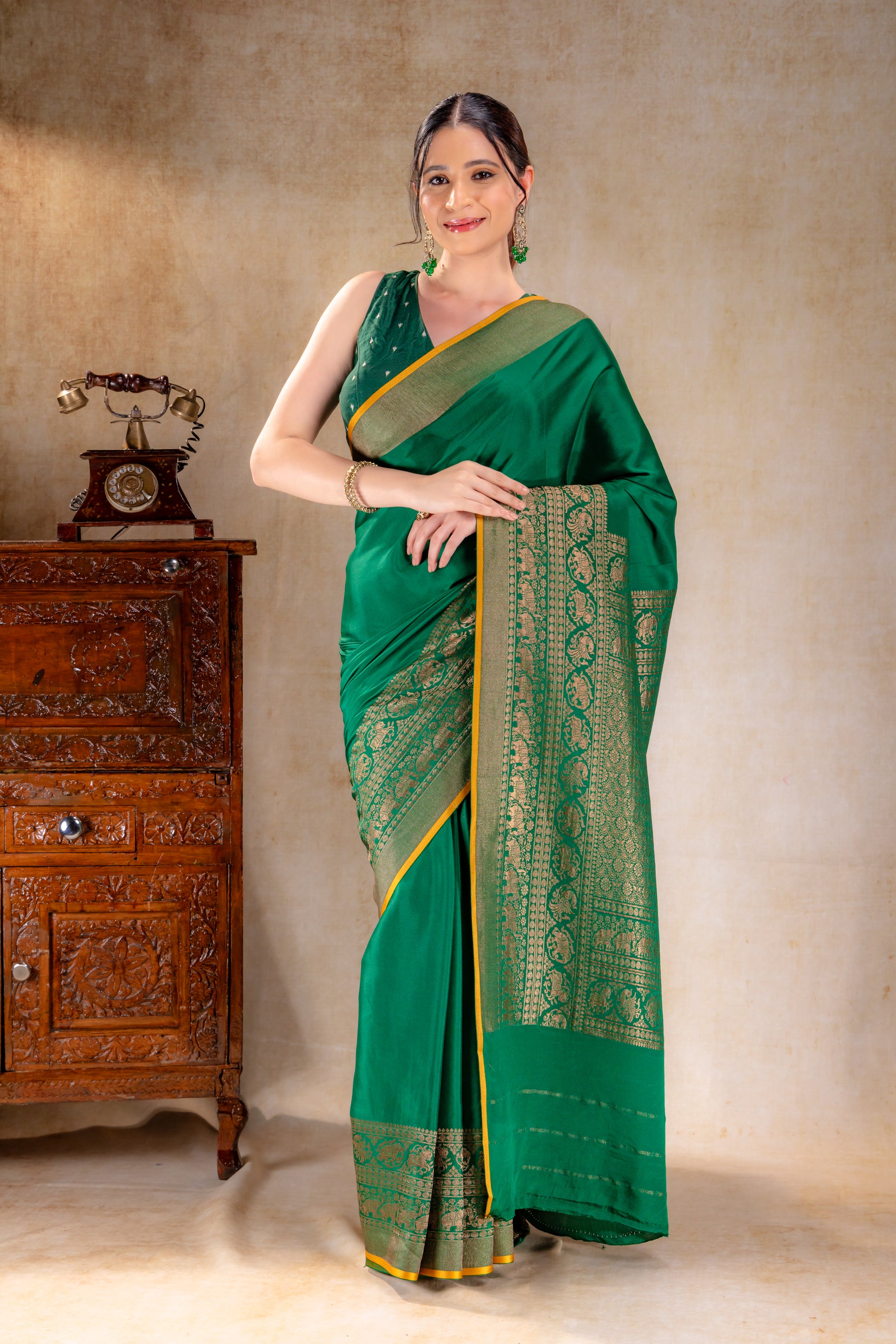 Emerald Green Crepe Silk Saree with Antique Elephant Zari Border