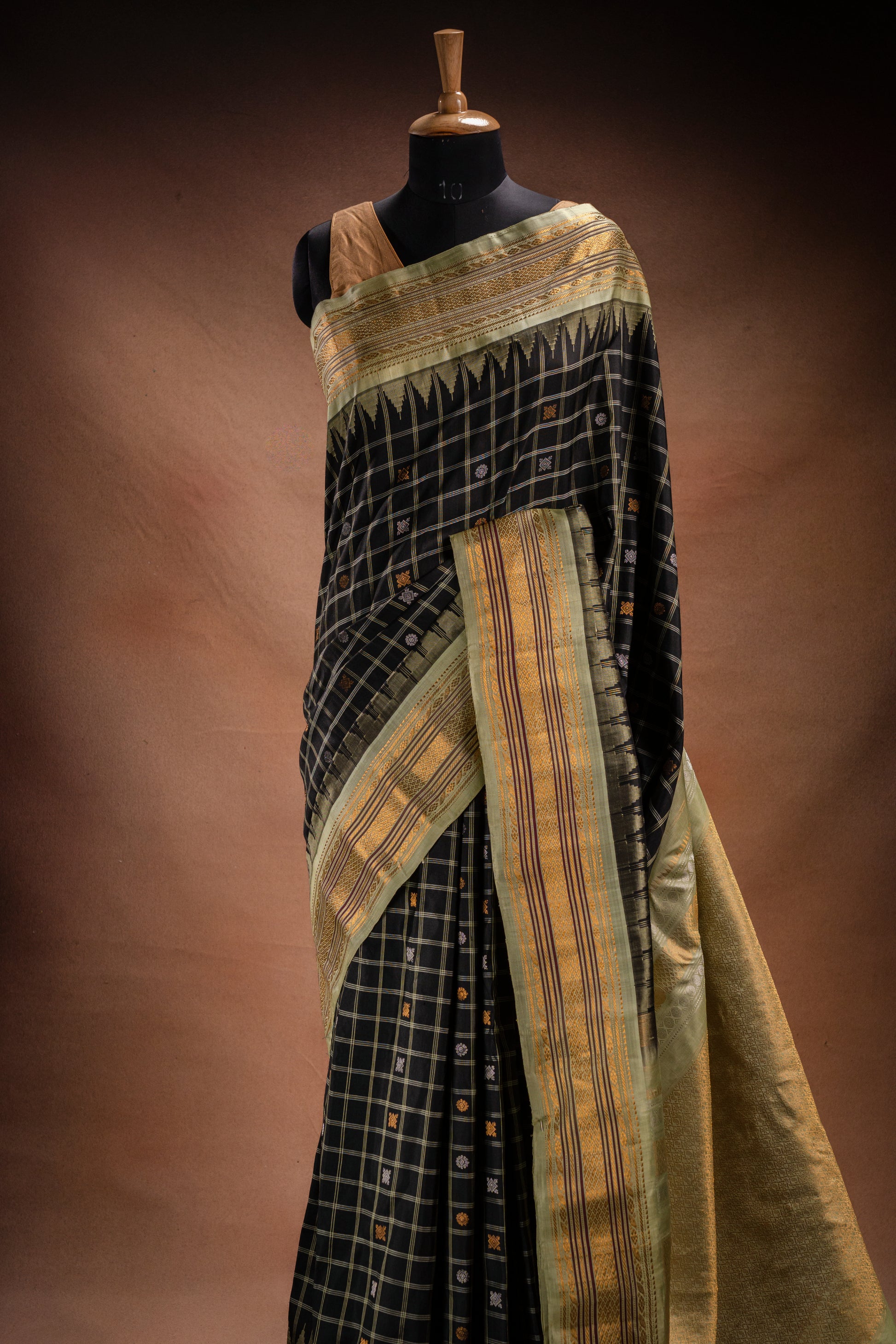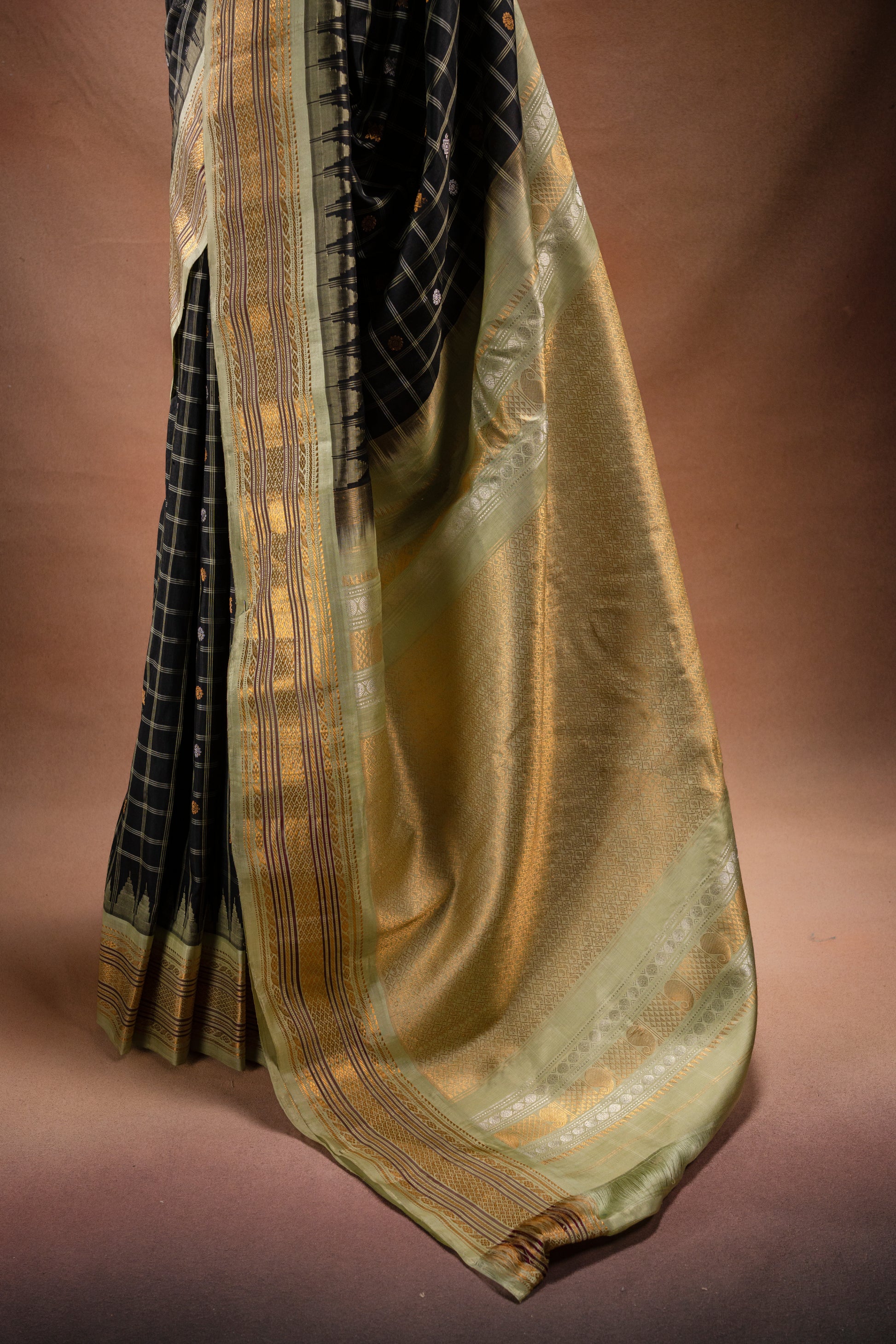 Elegant black checked Gadwal silk saree finished with an olive zari border.