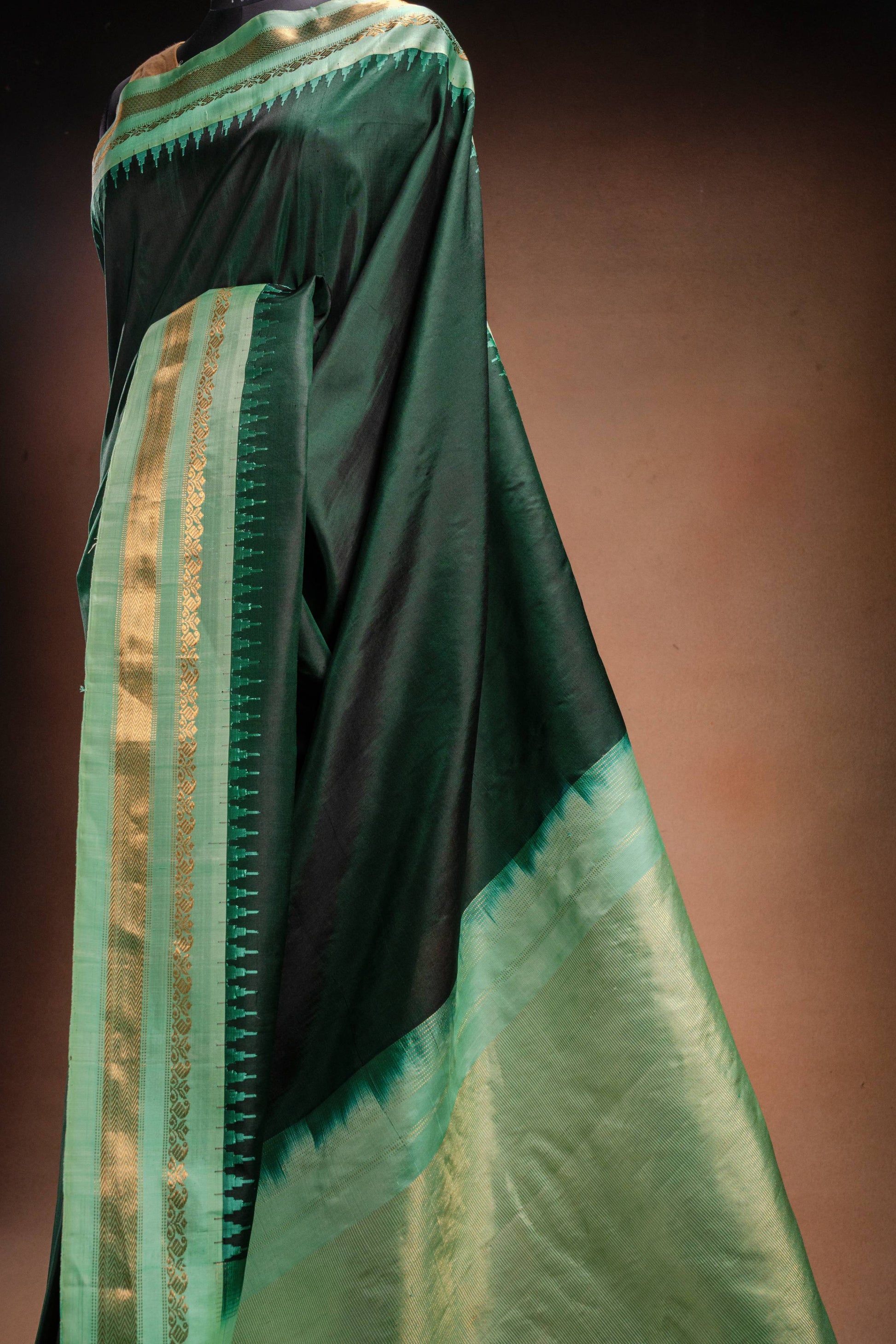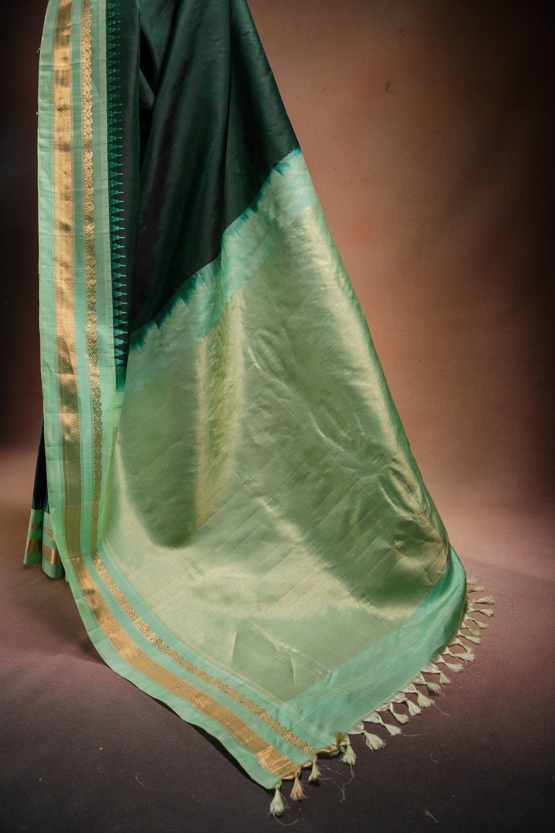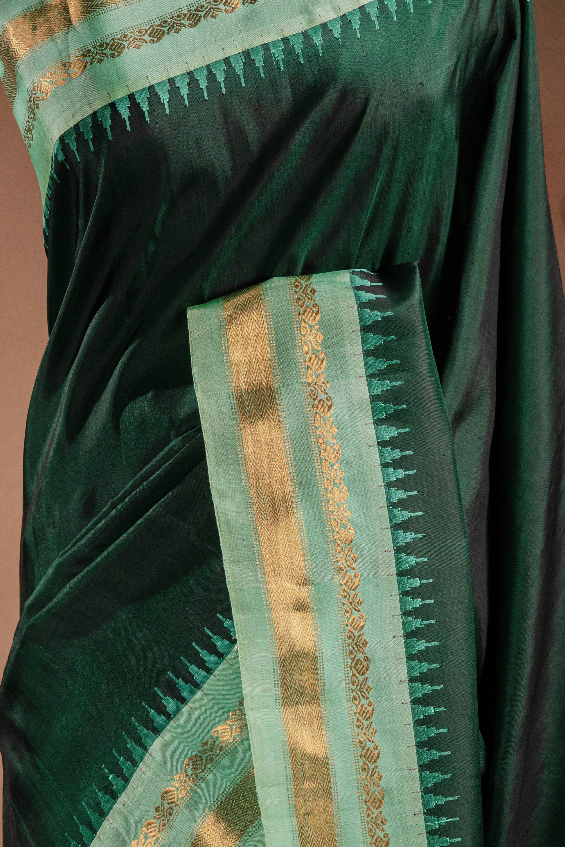 Striking dark green Gadwal silk saree paired with a soft light green zari border.