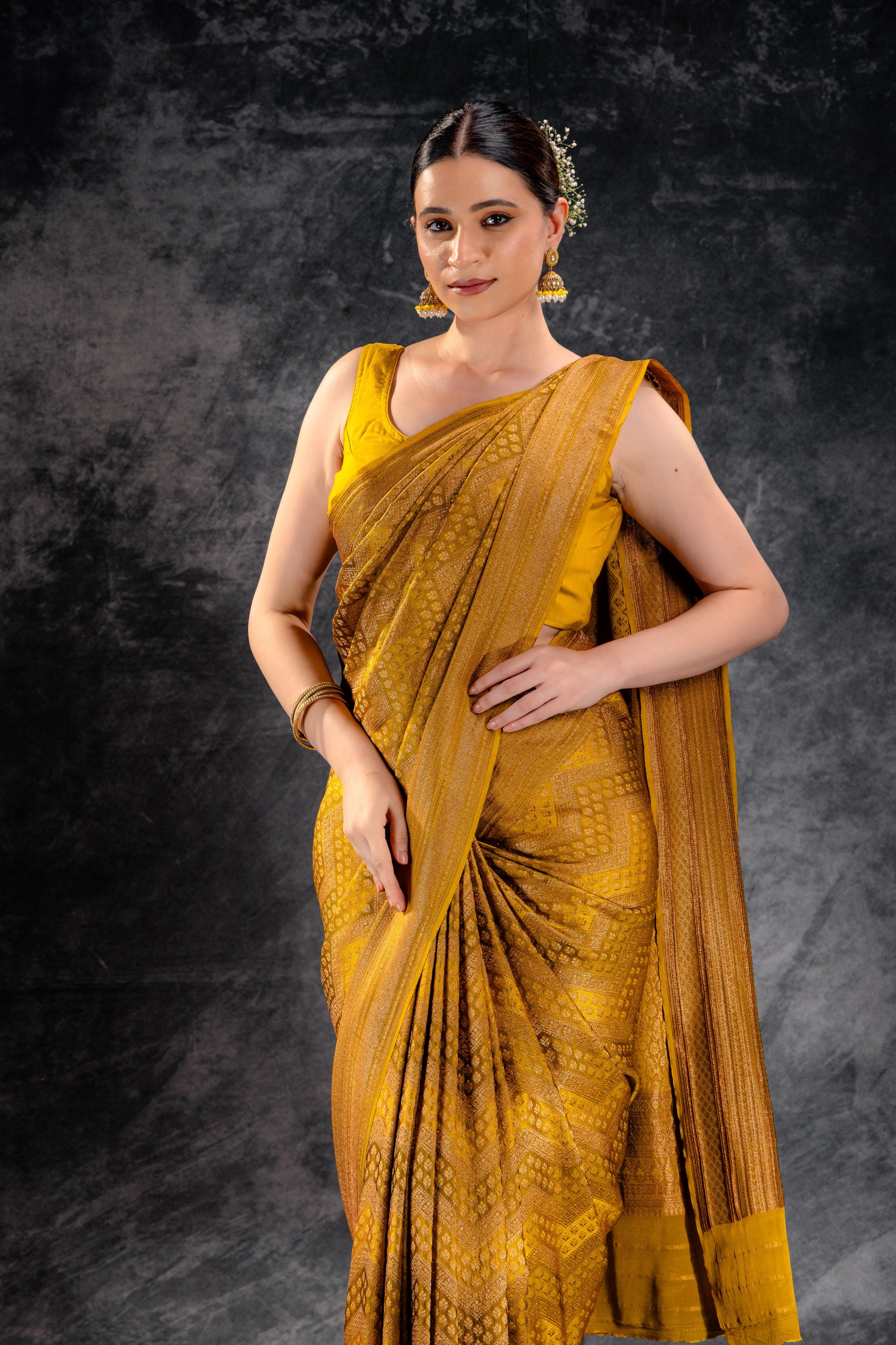 A vibrant mustard ochre crepe saree with fine zari arrow motifs in gold and silver, complemented by a soft satin border. IdeaRegular price INR. 12,400.00Regular priceUnit price / per -
