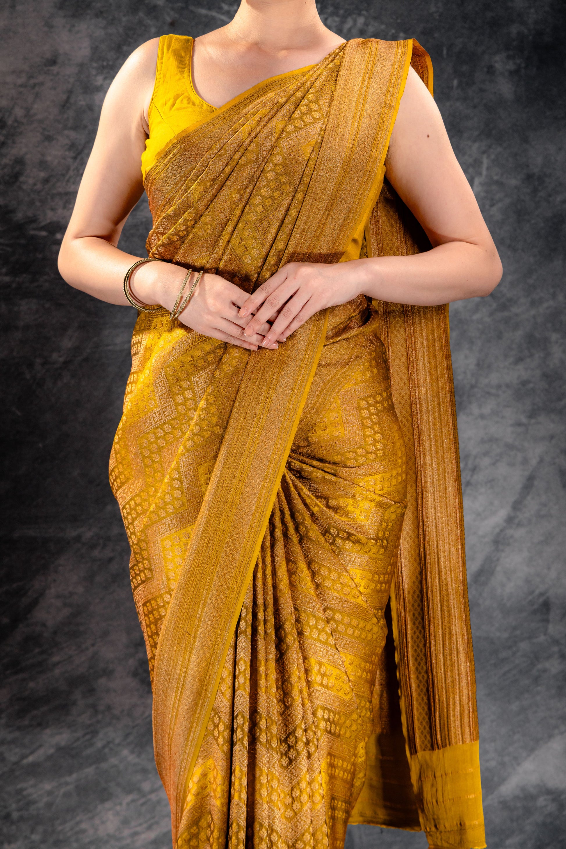 Mustard Yellow Vat Dyed Banarasi Silk Saree with Antique Zari Weave