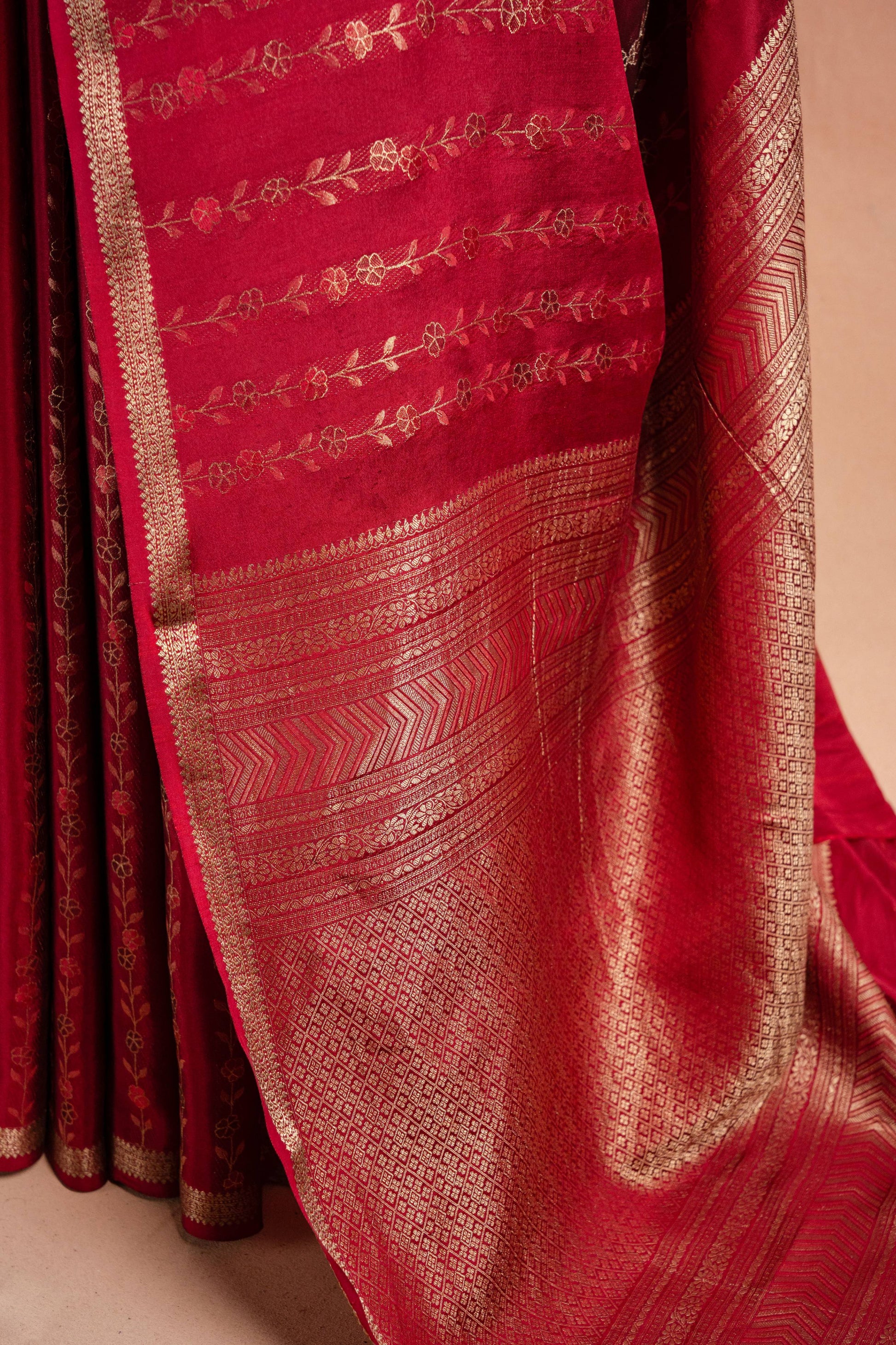 Rich red Banarasi silk saree adorned with golden floral zari motifs and a detailed border. Perfect for weddings and festive occasions.