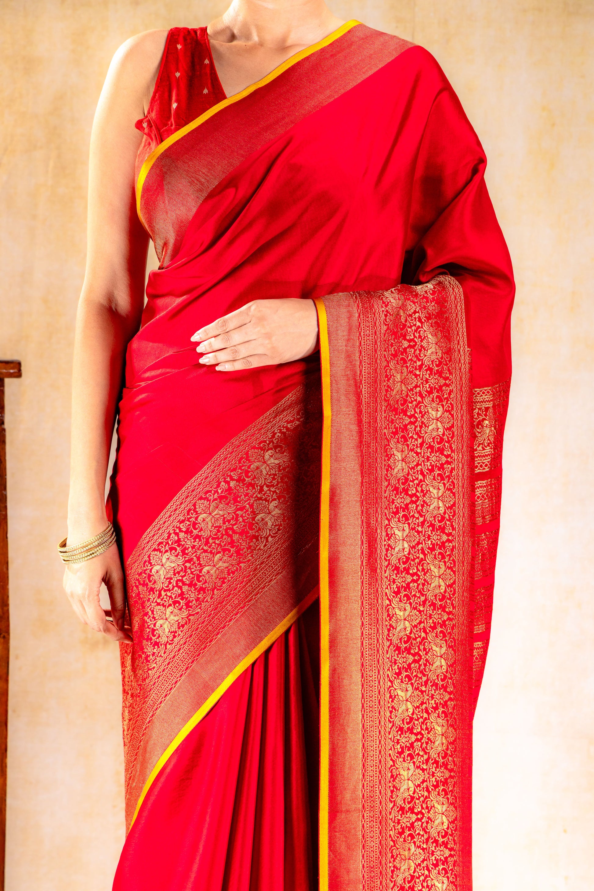 Red Crepe Silk Saree with Antique Zari Doble Peacock Border