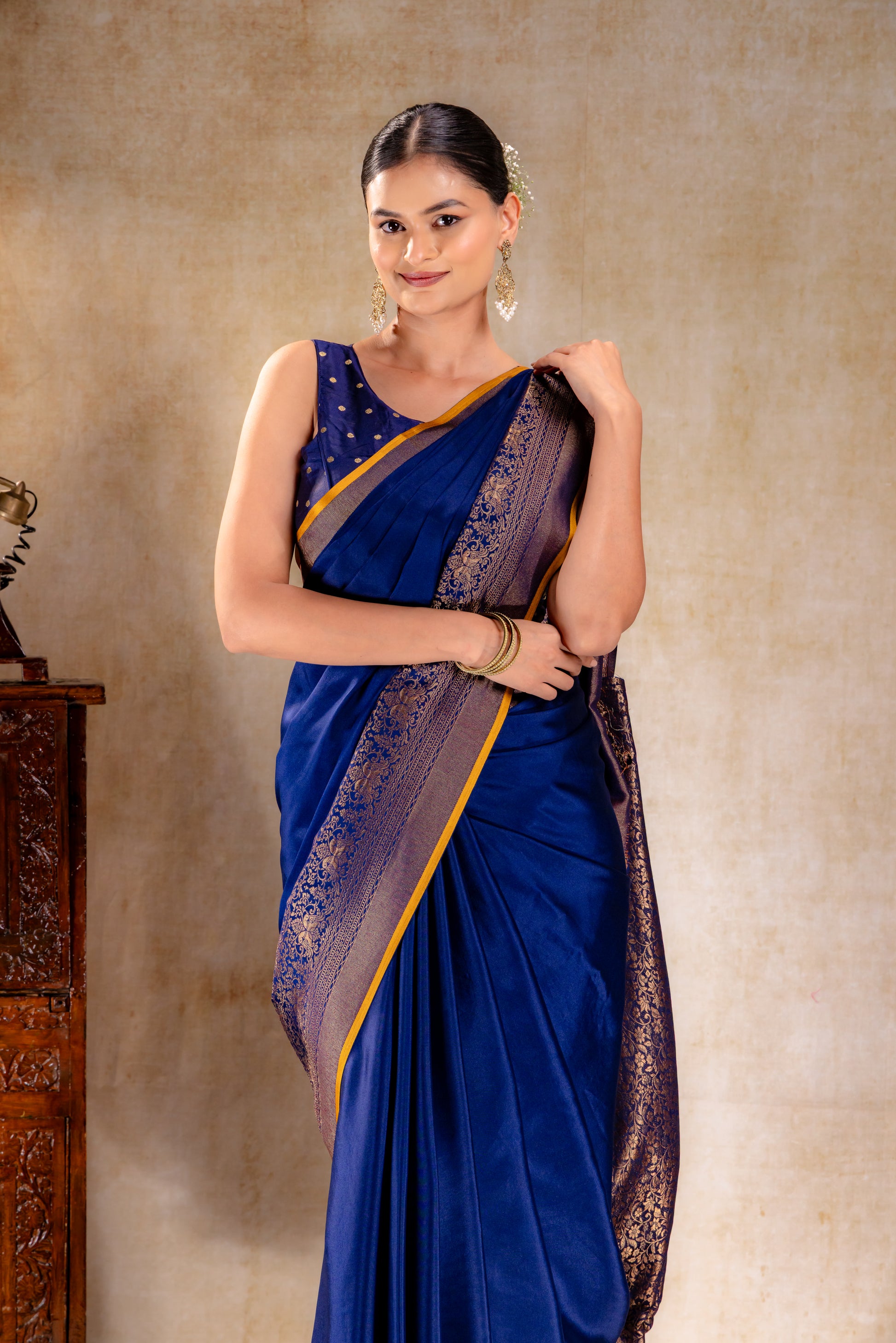 Royal Blue Crepe Silk Saree with Antique Zari Doble Peacock Border