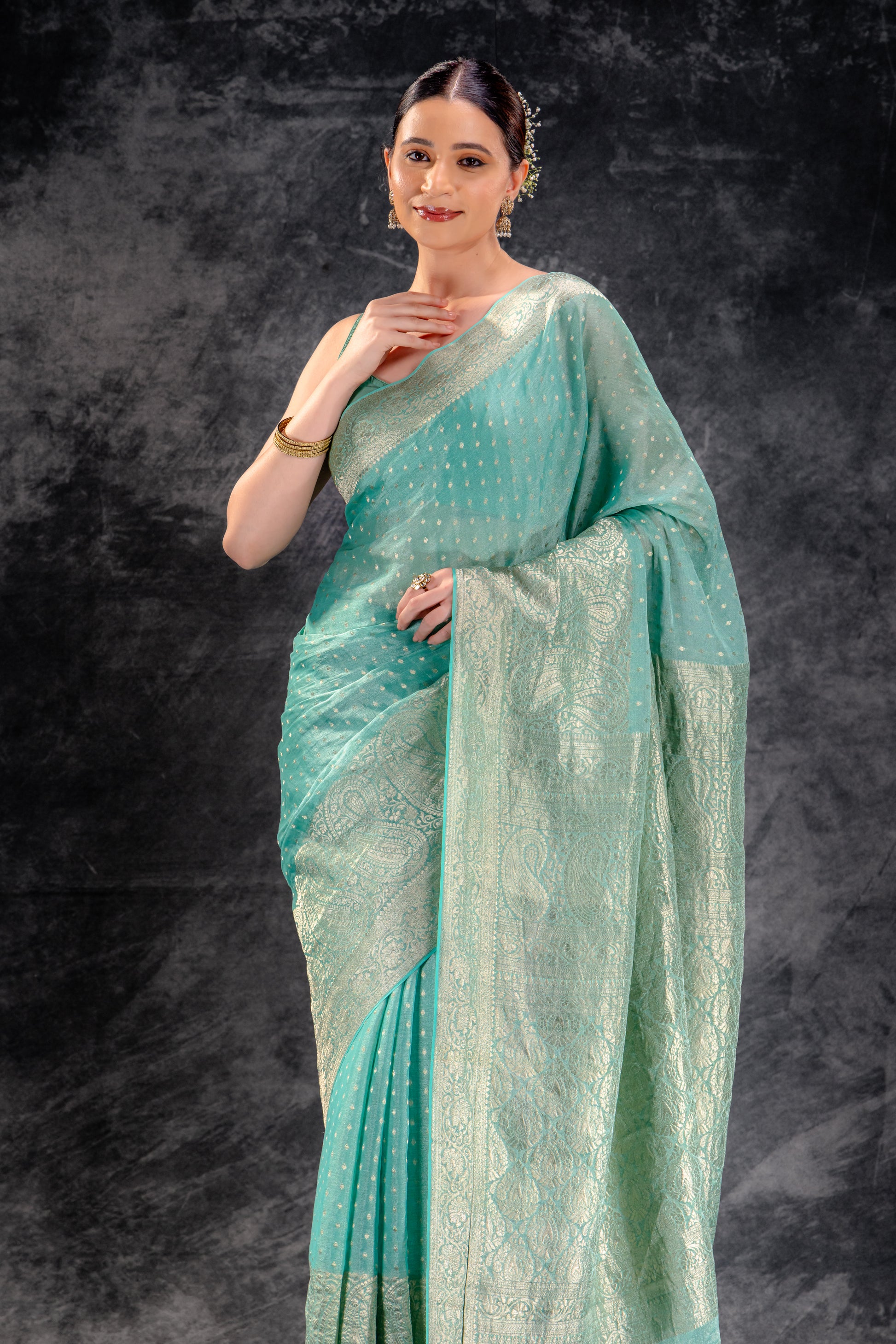 Sea Green Tissue Saree with Majestic Mango Border and Woven Buttas