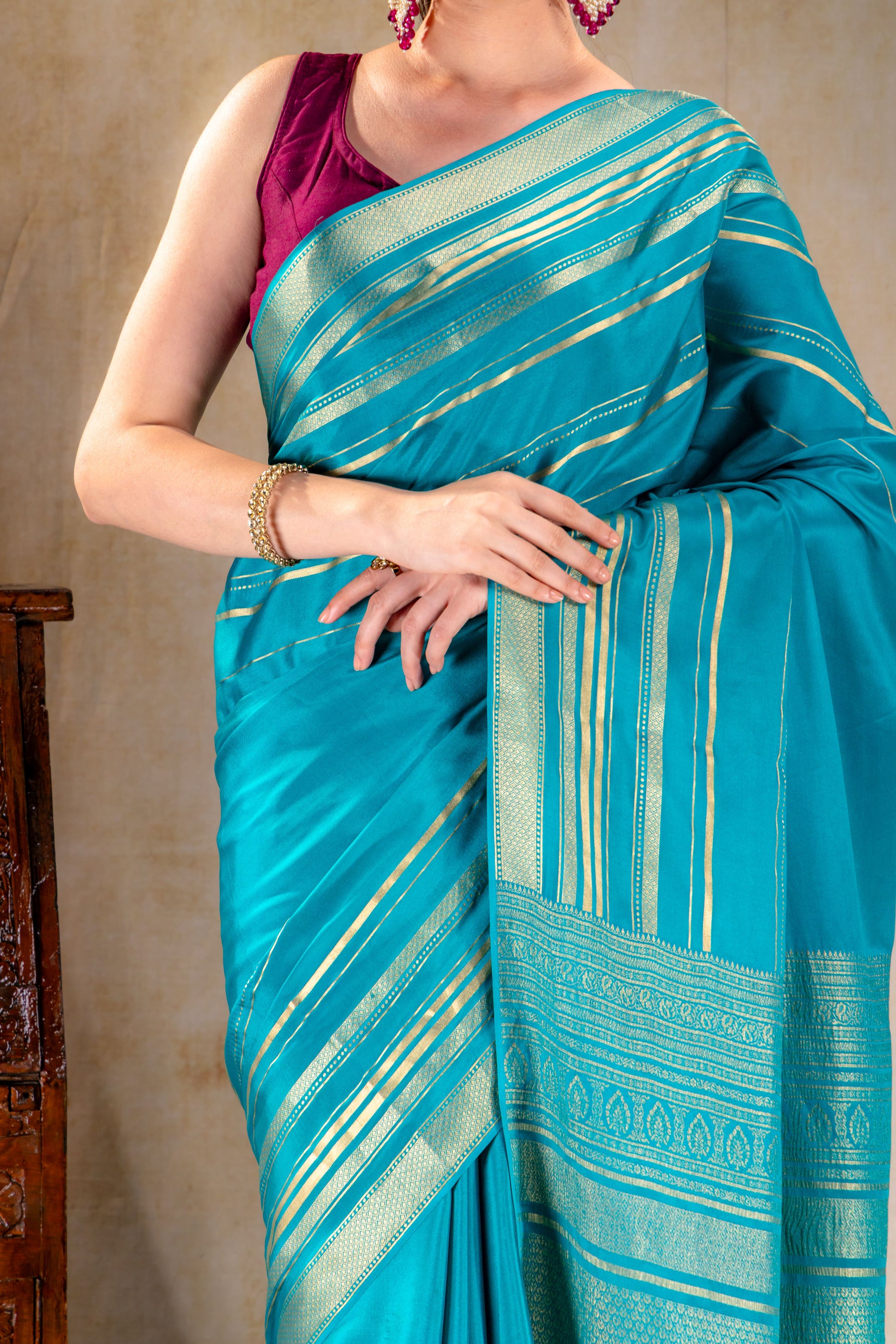 Teal Blue Crepe Saree Gold Zari Rich Border