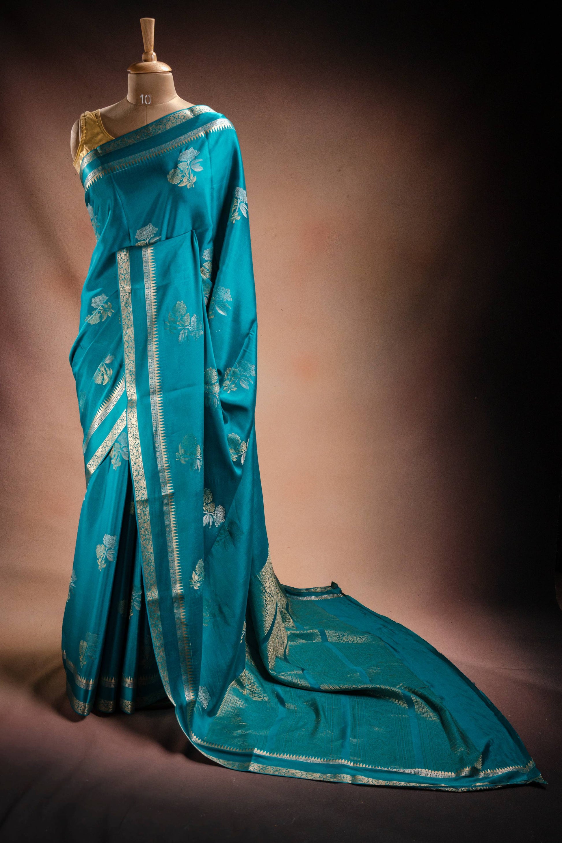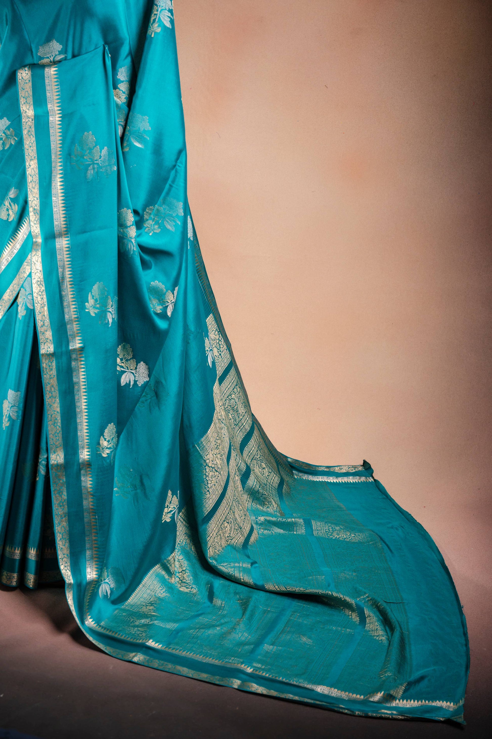 Sea Teal Zari Crepe Brocade Saree with Intricate Zari Floral Weave