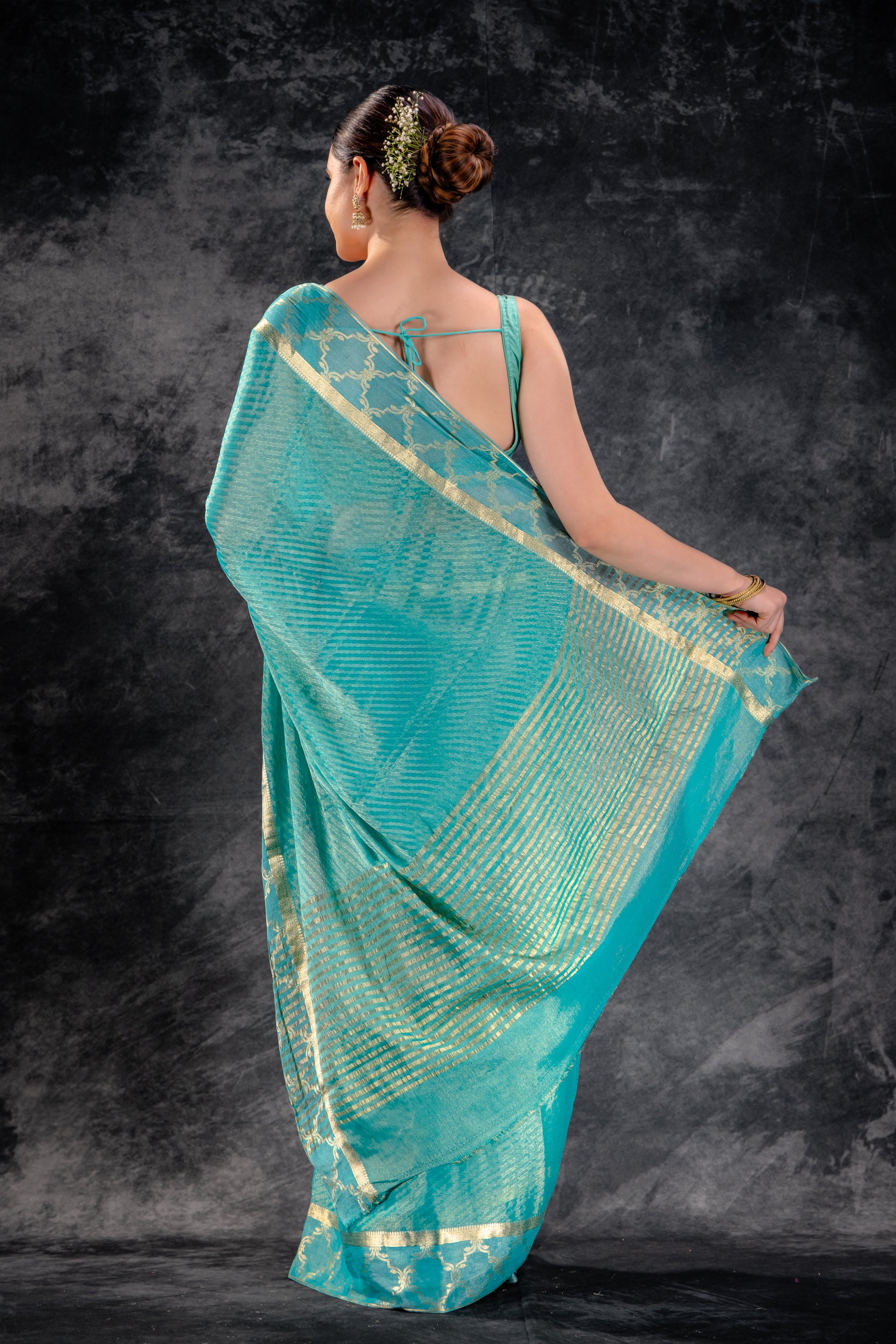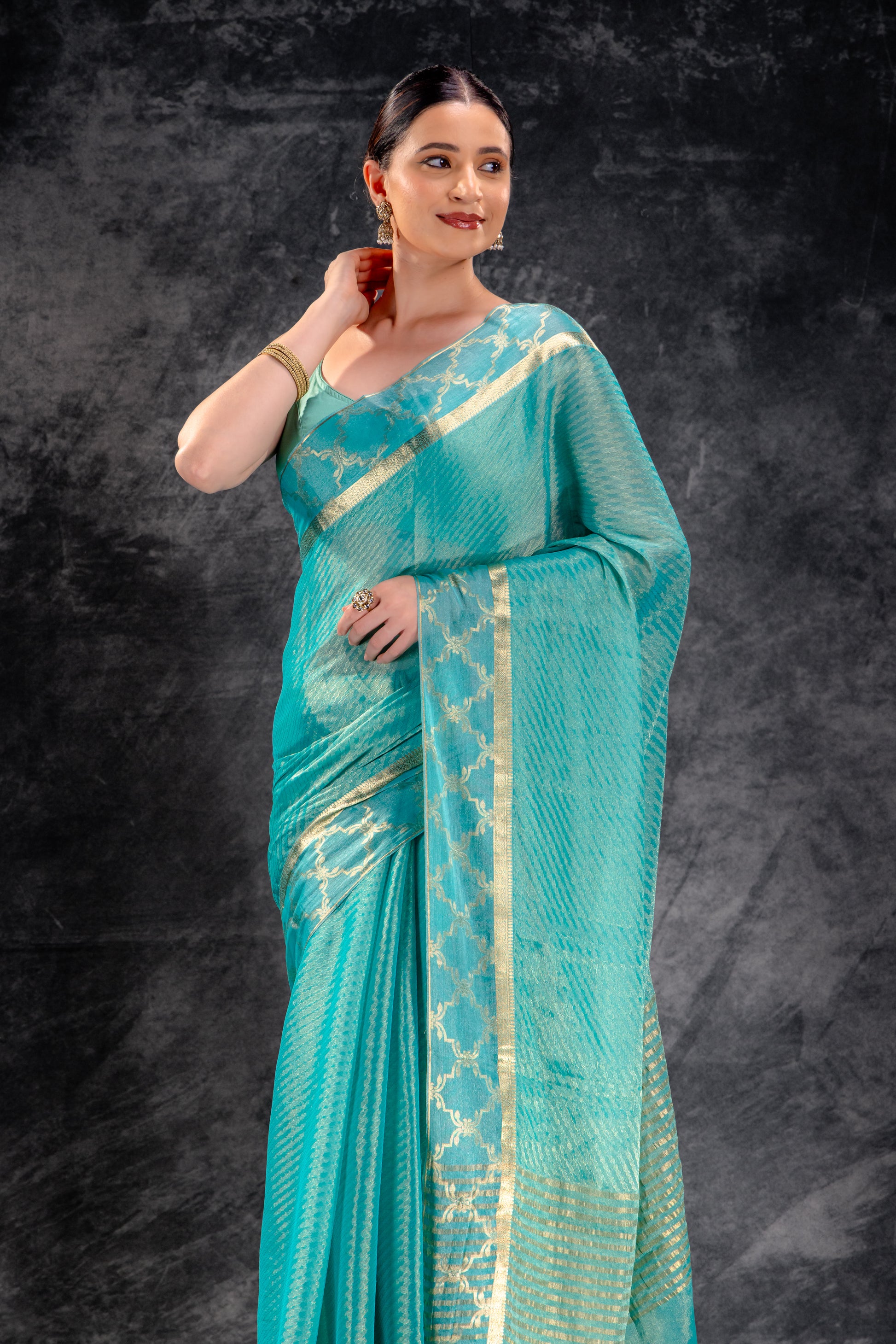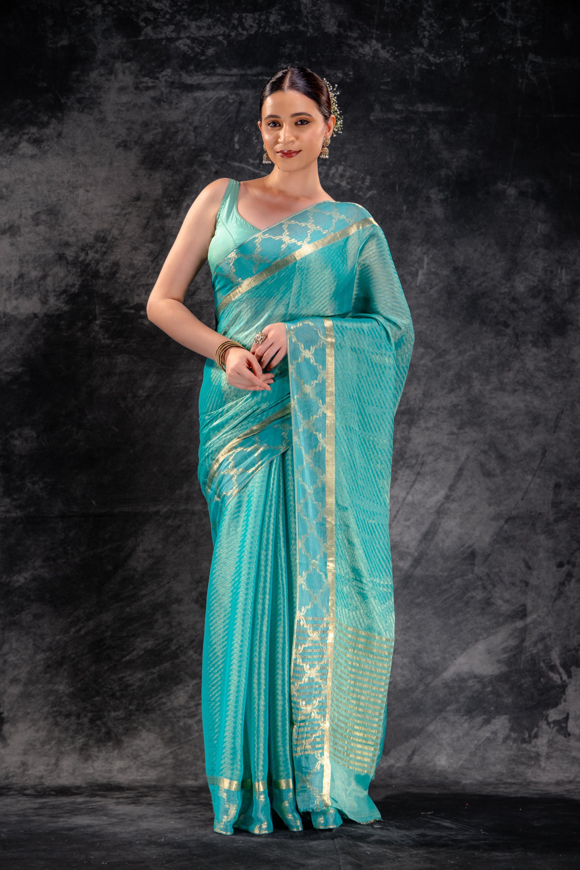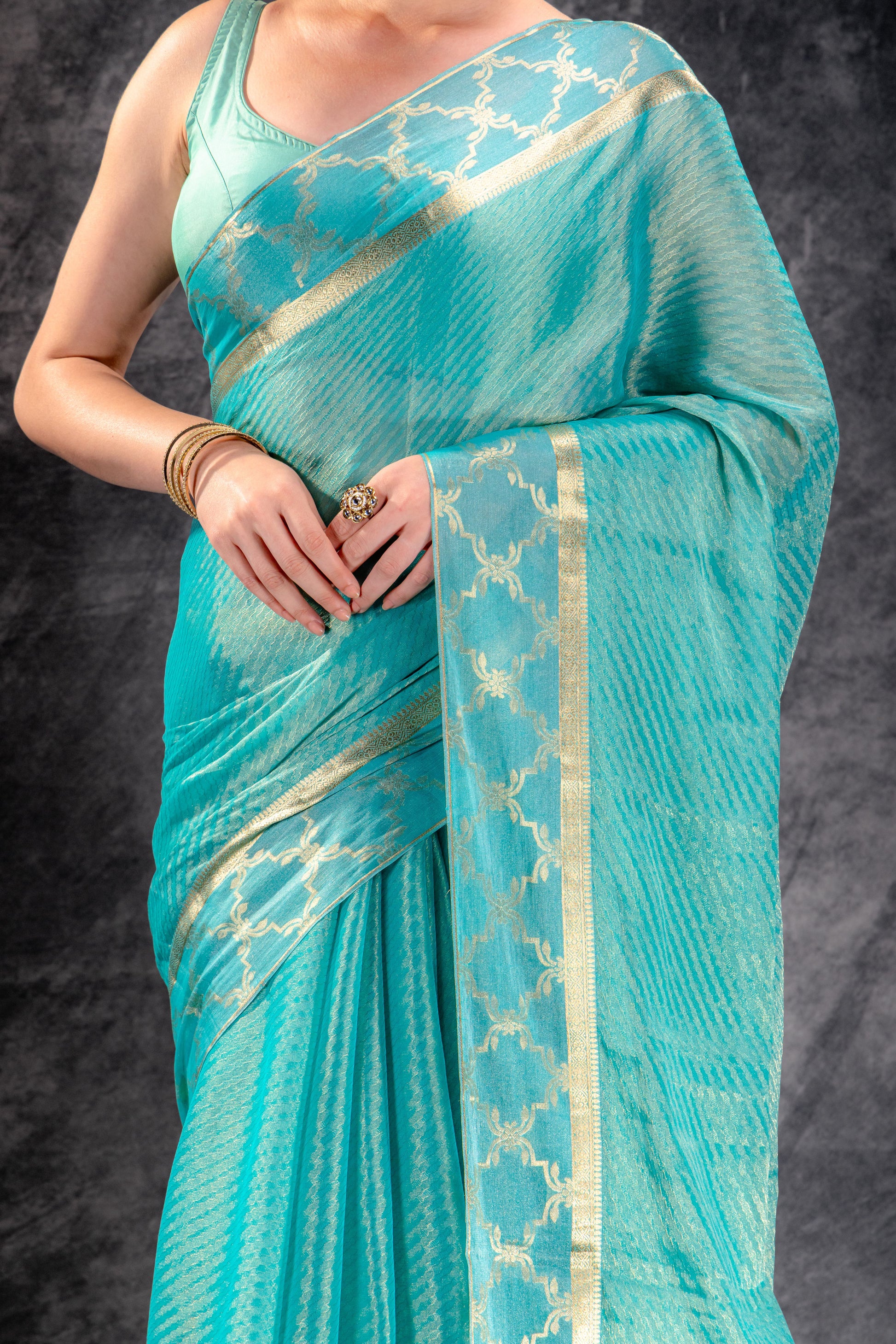Tissue Royale Aqua Saree with Gold Mughal Motif Border & Diagonal Zari Weave