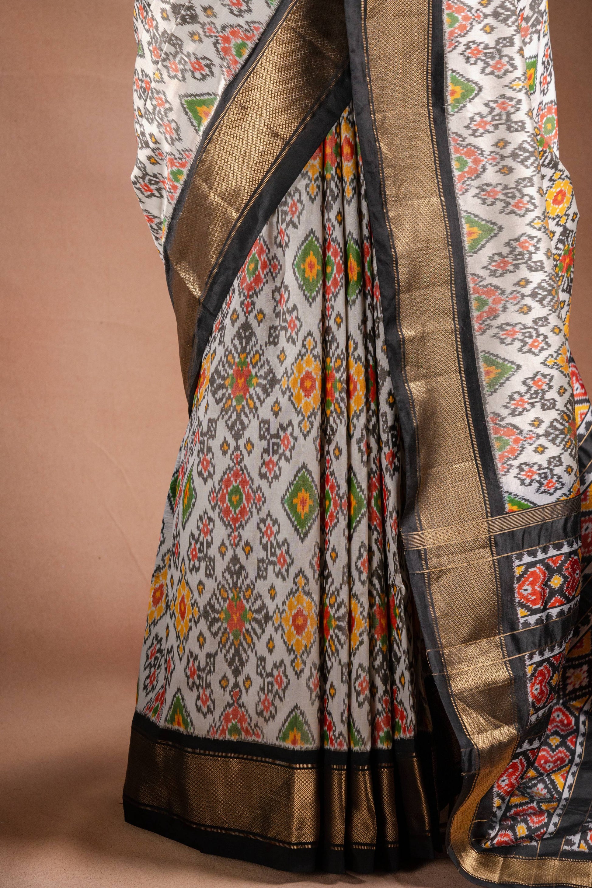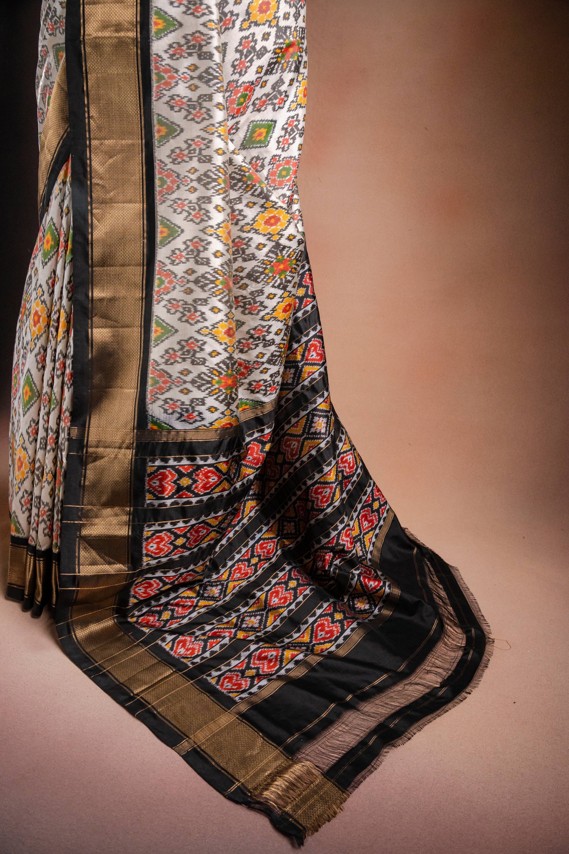 Stylish white Pochampally saree with black border and colorful ikat weave.